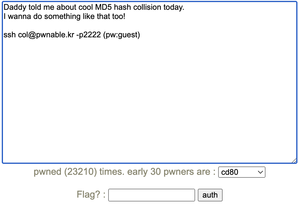 문제를 풀기 전에 주어진 접속 정보(ssh col@pwnable.kr -p 2222 (pw:guest))로 접속 했을 때 아래와 같은 파일 목록을 확인할 수 있습니다.