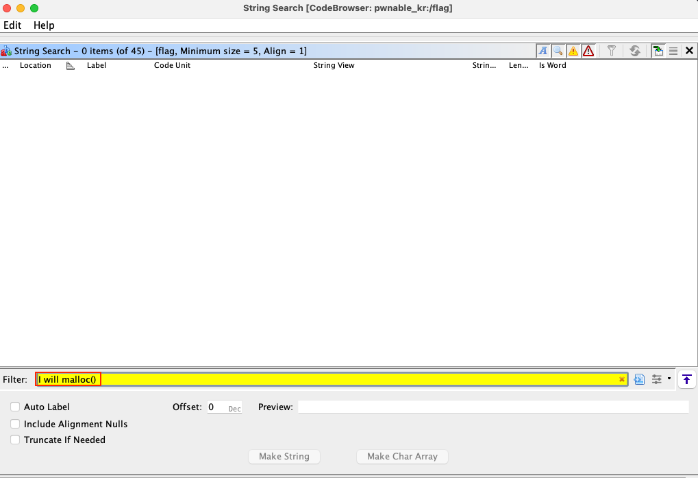 ghidra로 프로그램을 디컴파일 후 분석을 시도하려고 한다. main함수가 보이지 않아 주어진 문자열 (I will malloc()...)을 기준으로 main을 찾기 위해 시도 했습니다.